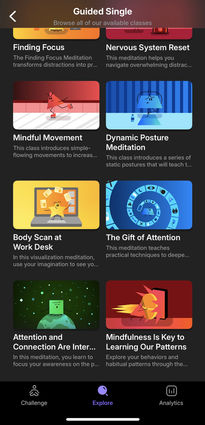 Thumbnails are used to be a visual representative of meditation classes. Each class follows a mascot or a feeling that falls into a category of sleep, productivity, relationships, mental health, mindfulness and women's health.